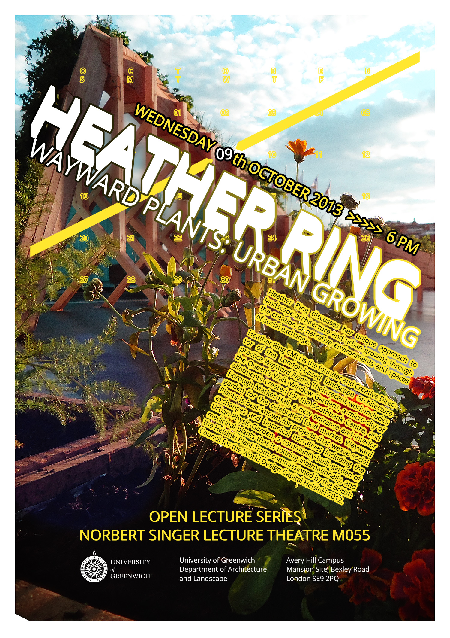 On Wednesday 9th October at the University of Greenwich, 6:00pm at Avery Hill, Heather Ring will discus her unique approach to landscape architecture and urban growing through the creation of narrative environments and spaces of social exchange.
