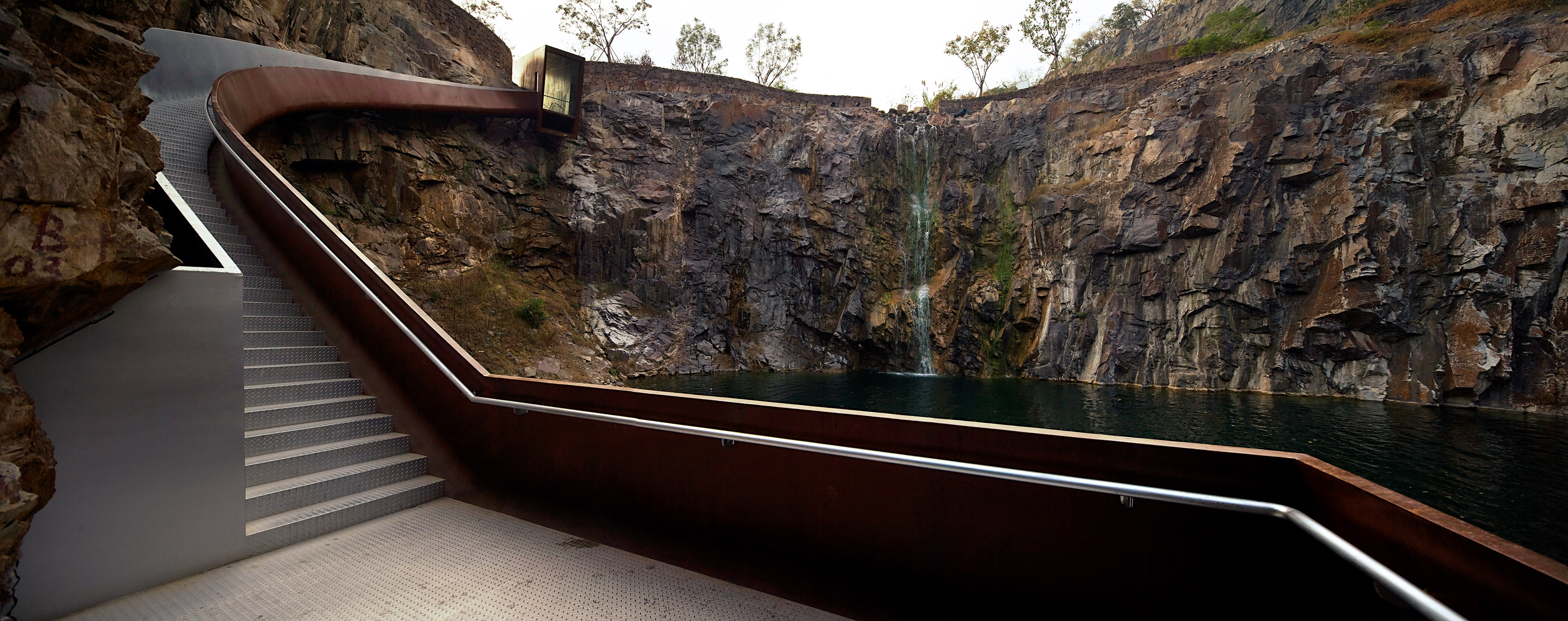 At the stone pit east-west “eyes” have been dug out of the severely weathered surface of the mountain. The platform-a section left over from quarrying-and a terrace to its north are made up of layers of retaining wall construction to avoid landslides. The site has an overall difference in height of about 30m and a more than 20m deep clear pool complete with islands of vegetation. The whole bleak robust site had great potential as a “garden.”