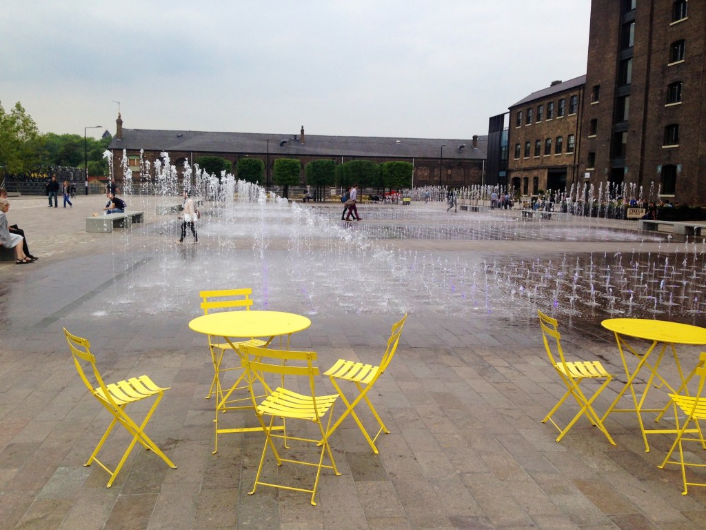 As you arrive from St. Pancras you can already see the quality of the materials, that provides unity throughout the project; mainly brick, stone and gravel, all in harmony with the old, brick buildings of the site. Also we can find the same metal chairs and tables (in yellow and dark grey) at different parts of the development, which is a nice touch.