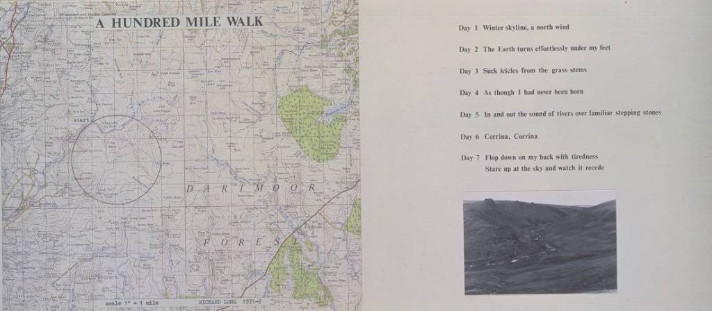 There are a couple of things that I’m interested in about this statement, first being Long’s application of anonymity. It isn’t important that the public recognises the journeys themselves that Long has manipulated into the environment, but that these events exist within the boundaries of time, and through the permanent context of photography, maps, writings.