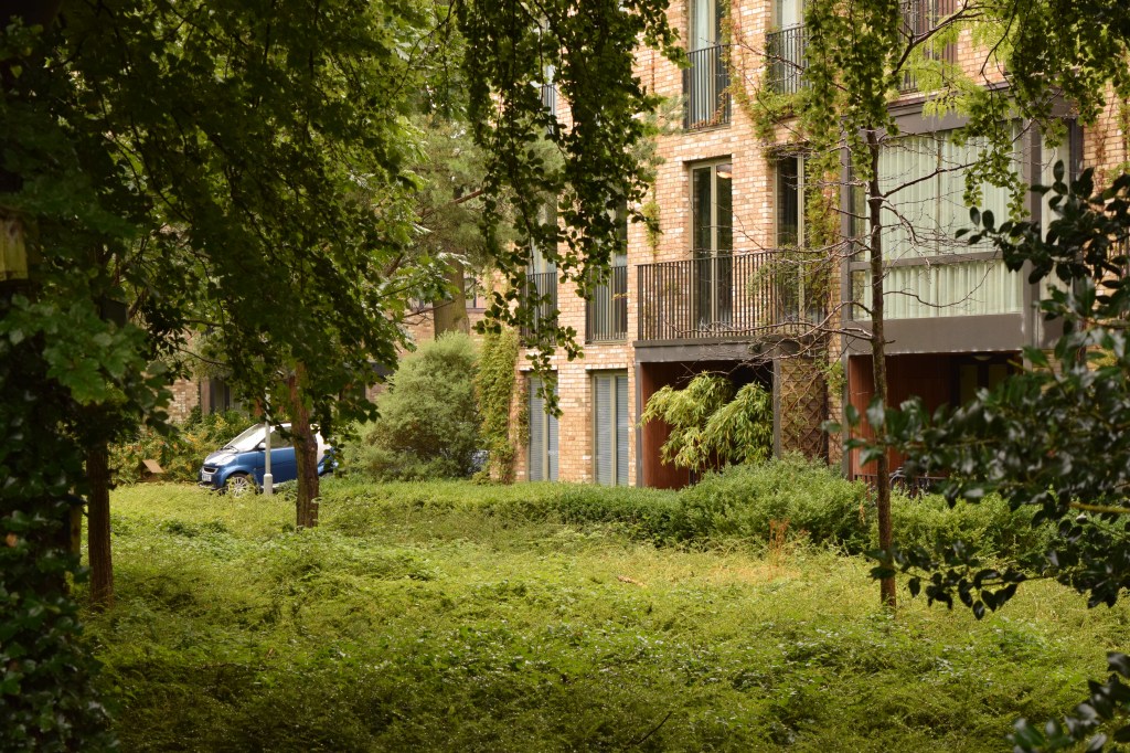 The planting is green and compliments the mature trees giving a sense of a natural environment without leaving too much responsibility on individual dwellers to maintain their own gardens.