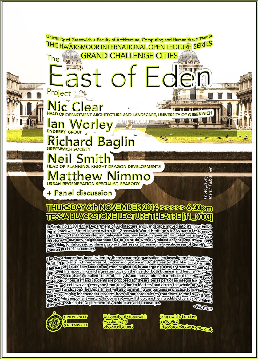 In September 2014 the Department of Architecture and Landscape moved into it’s new building in Stockwell Street located within the Greenwich World Heritage site. As part of that move I felt it important to consider not only what our new location gives us, but what we might give in return to our new neighbourhood. So to coincide with our relocation, the Department are embarking on a cross-disciplinary project that seeks to reimagine specific areas of South East London in the 21st century.