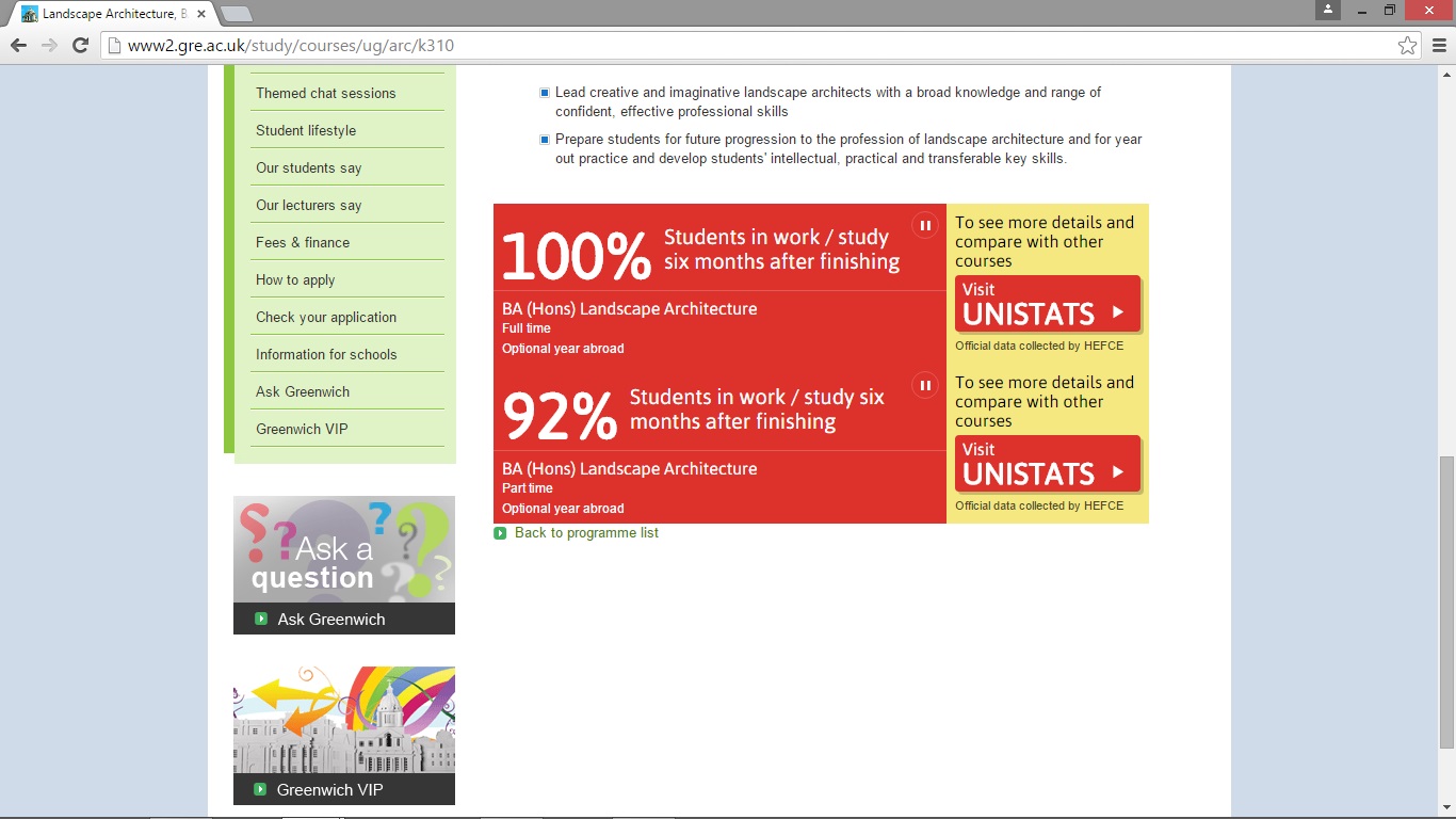 The UNISTATS data, collected by HEFCE (Higher Education Funding Council for England), reveals that 100% of the full-time students graduating from the BA (Hons) Landscape Architecture programme at the University of Greenwich are in jobs/study within 6 months of graduation.